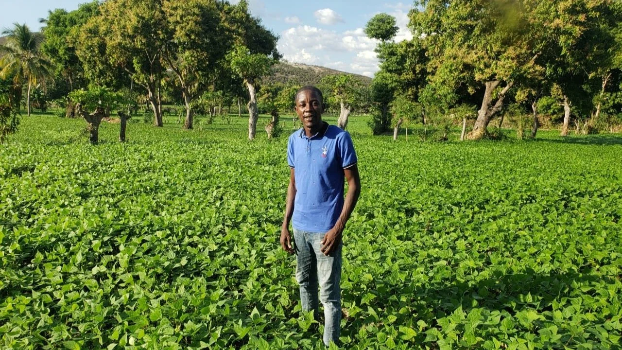 Haitian leader Absolu stands amidst a thriving field of bean plants, reflecting on the success of last year's abundant harvest.