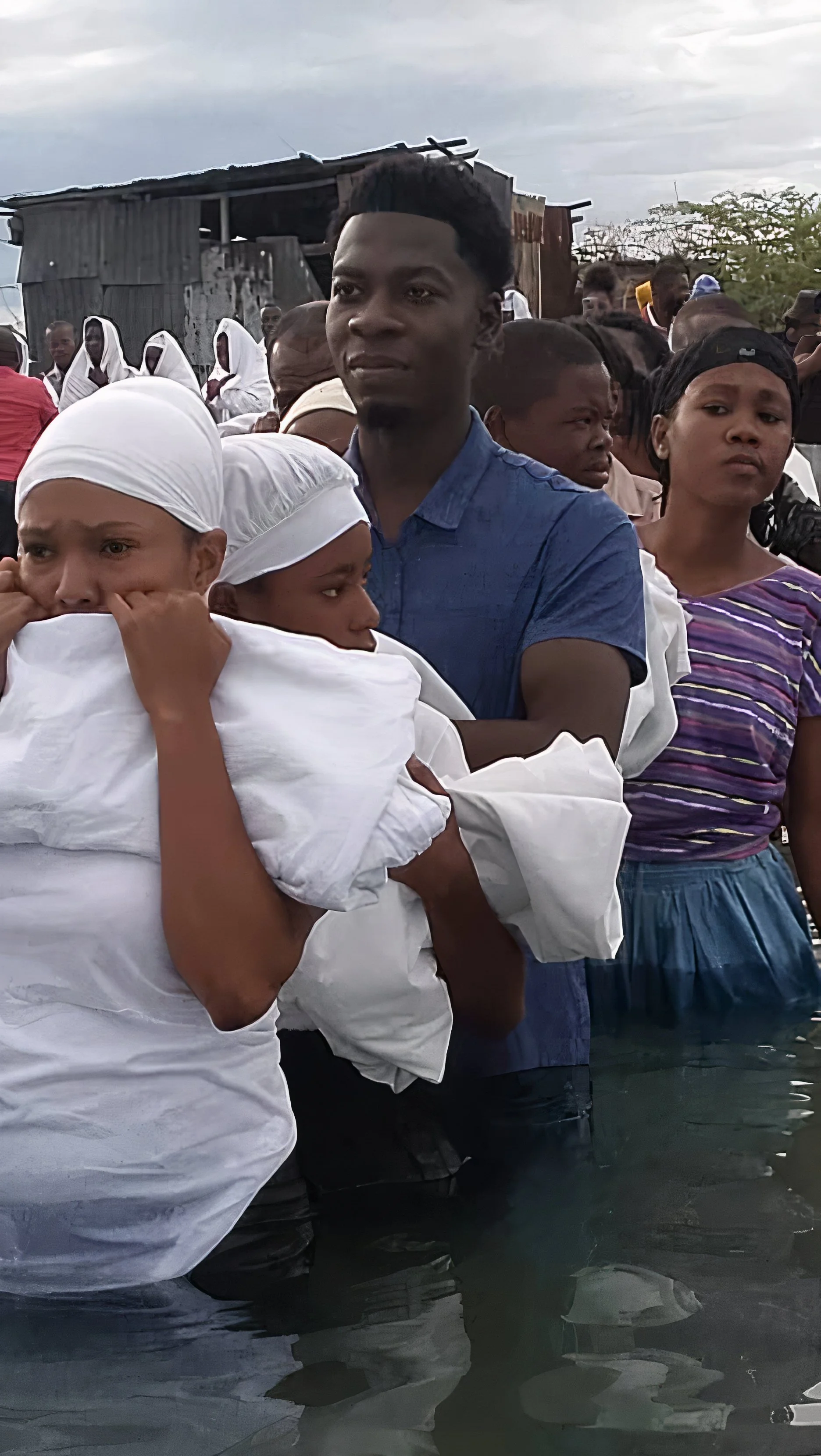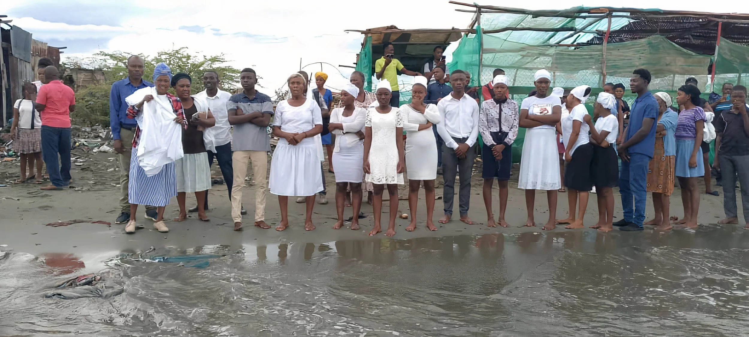 New brothers and sisters wait their turn to be baptised.